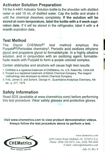 Ethylene glycol and propylene glycol are the primary ingredients in commercially- available antifreezes. They are used with various corrosion inhibitors to protect metal surfaces in cooling water systems. Measures 1 to 15 ppm as Ethylene Glycol. Dilute the sample for higher ranges. Note in order to prepare the A-4401 activator you will require 15 ml of distilled water.Test procedure: