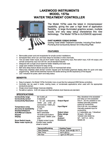The LakeWood Instruments Model 1575e Controller uses the latest in microprocessor capability, giving the user a high level of application flexibility. A large illuminated graphics screen, multiple inputs, and very easy setup characterize this new technology. The Model 1575e is ETL approved.- Removable power cord and receptacles for simple conduit installations.