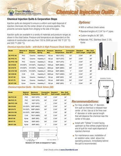 - Custom length injection quills to 24" WITH an internal check valve are available.